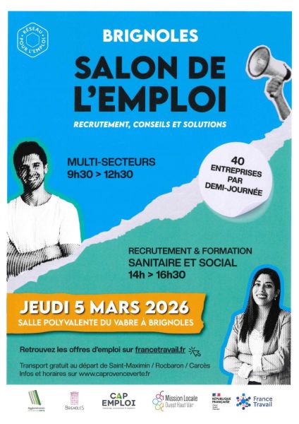L'Agglomération Provence Verte, France Travail Brignoles, Cap Emploi 83 et la Mission Locale Ouest Haut Var organisent le :