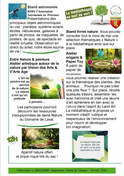Cette année la médiathèque de Varages fête sa nature dans un cadre exceptionnel de la commune, au Domaine de Laval à l’occasion de la semaine nationale « Fête de la nature ».