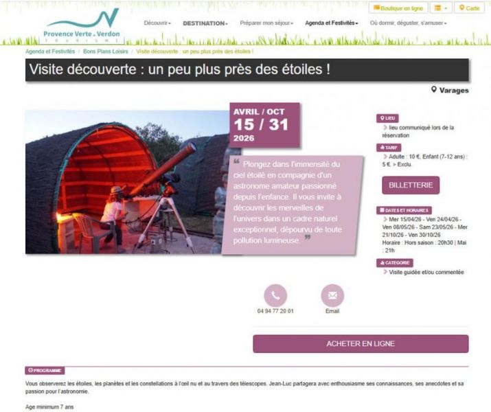 Vous observerez les étoiles, les planètes et les constellations à l’œil nu et au travers des télescopes. Jean-Luc partagera avec enthousiasme ses connaissances, ses anecdotes et sa passion pour l’astronomie.